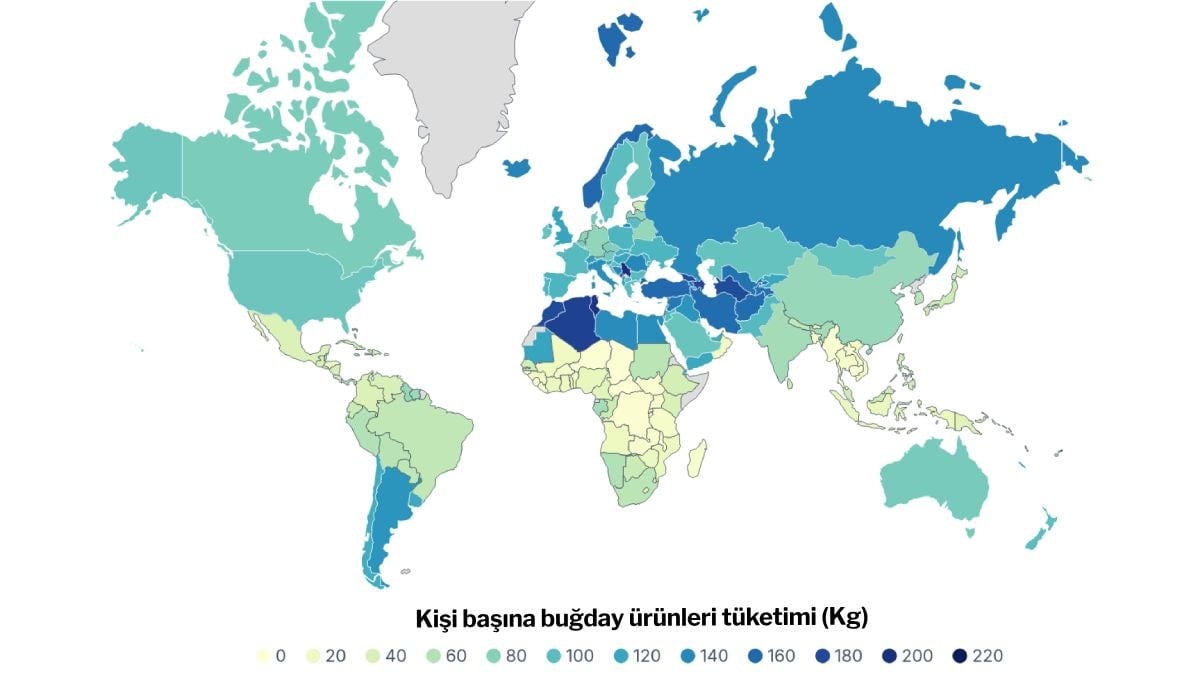 Buna karşın buğday ürünlerinin tüketiminde Türkiye ilk 10’a girdi. Türkiye’de kişi başına ekmek ve makarna gibi buğday ürünlerinin tüketimi 160 kilograma ulaştı, 9. sıraya girdi.