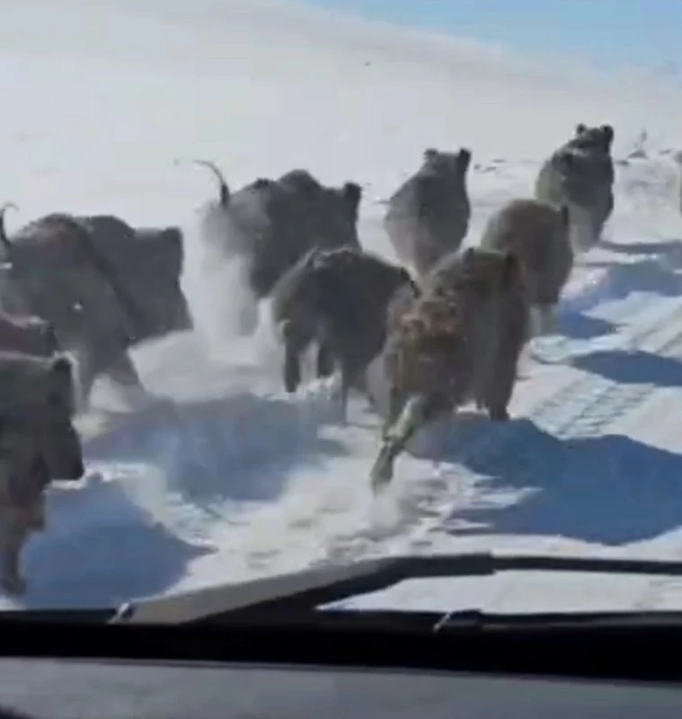 Bir süre arıcın önünde koşan domuzlar daha sonra karlı bölgede gözden kayboldu.
