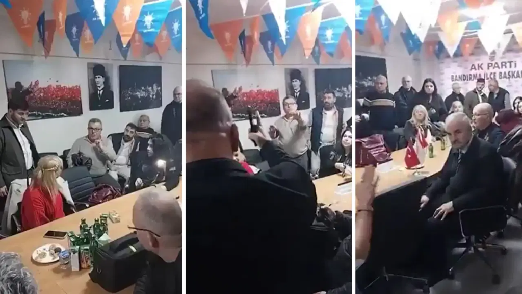 Balıkesir Bandırma’daki AKP İlçe Teşkilatı toplantısında ortalık karıştı. Teşkilat Başkanı Bayram Özdemir ile Osman Bezirci arasında çıkan tartışma kavgaya dönüştü. Masayı yumruklayan Özdemir sürahi ve mikrofon fırlatmaya çalıştı, görüntü alanları tehdit etti, “Basına yansırsa yakarım” dedi. İşte o anlar…