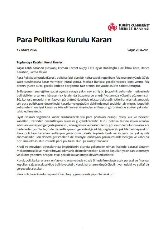 Toplantı sonucunda politika faizi yüzde yüzde 37 seviyesinde sabit tutulması yönünde oldu. Kurul ayrıca, Merkez Bankası gecelik vadede borç verme faiz oranını yüzde 40’ta, gecelik vadede borçlanma faiz oranını ise yüzde 35,5’te sabit tuttu.