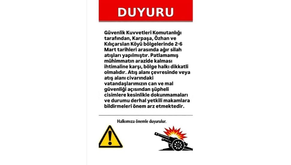 Kaymakamlık, Karpaşa, Özhan ve Kılıçarslan köyleri çevresinde 2-6 Mart tarihlerinde yapılan ağır silah atışları sonrası patlamamış mühimmat bulunma ihtimaline karşı vatandaşları uyardı; şüpheli cisimlere dokunulmaması ve yetkililere bildirilmesi istendi.
